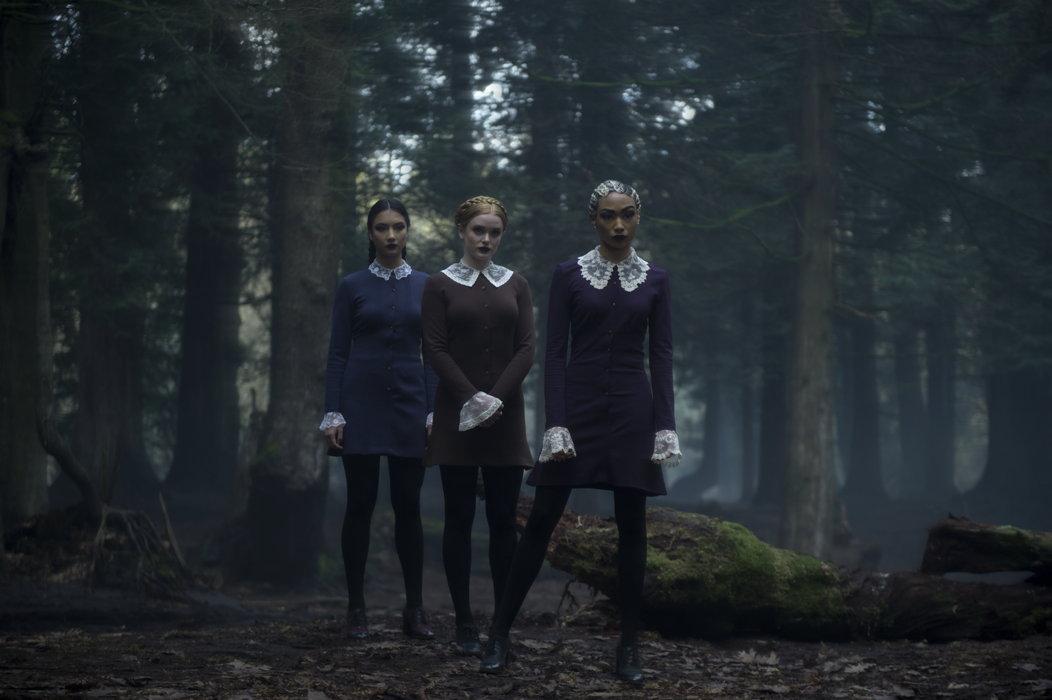 Metade humana, metade bruxa e definitivamente poderosa, Sabrina está apenas começando sua educação sombria como feiticeira, ao mesmo tempo em que tenta manter uma vida normal como aluna do segundo ano do ensino médio na Baxter High. Inteligente, compreensiva e corajosa a ponto de ser imprudente, Sabrina é tudo que está entre nós humanos e as forças do mal que ameaçam o mundo. Na foto, com Lachlan Watson (como Susie Putnam), Jaz Sinclair (como Rosalind Walker) e Ross Lynch (como Harvey Kinkle).