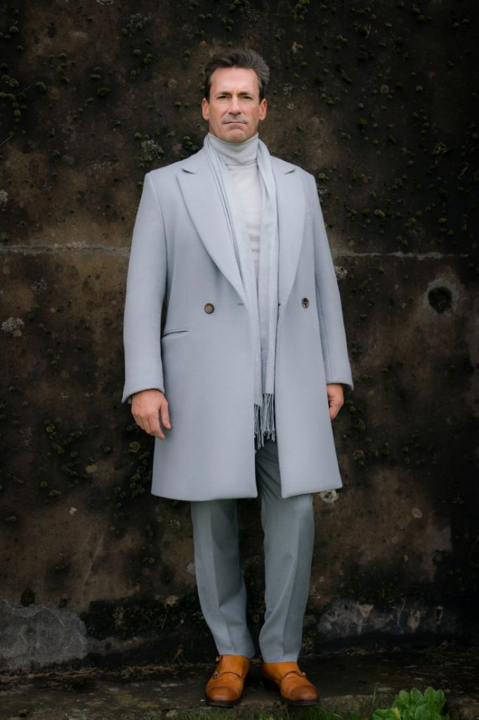 Na imagem vemos o ator Jon Hamm no papel do Arcanjo Gabriel, o mensageiro primário de Deus.