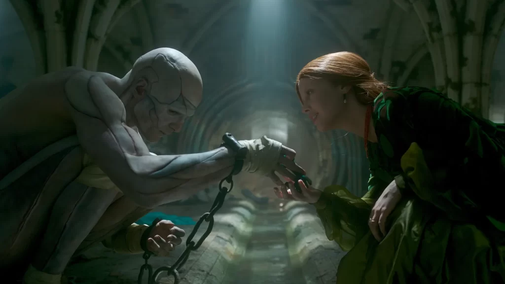 E o trabalho do atores é fantastico em dar vida para os dilemas e dramas tanto na figura deturpada, caótica, mas humana de Oscar Isaac como na estranha, inocente e sensível da Criatura que é extremamente bem caracterizado pela maquiagem e próteses, mas possui maior força dentro das expressões singelas e complexas de Jacob Elordi.