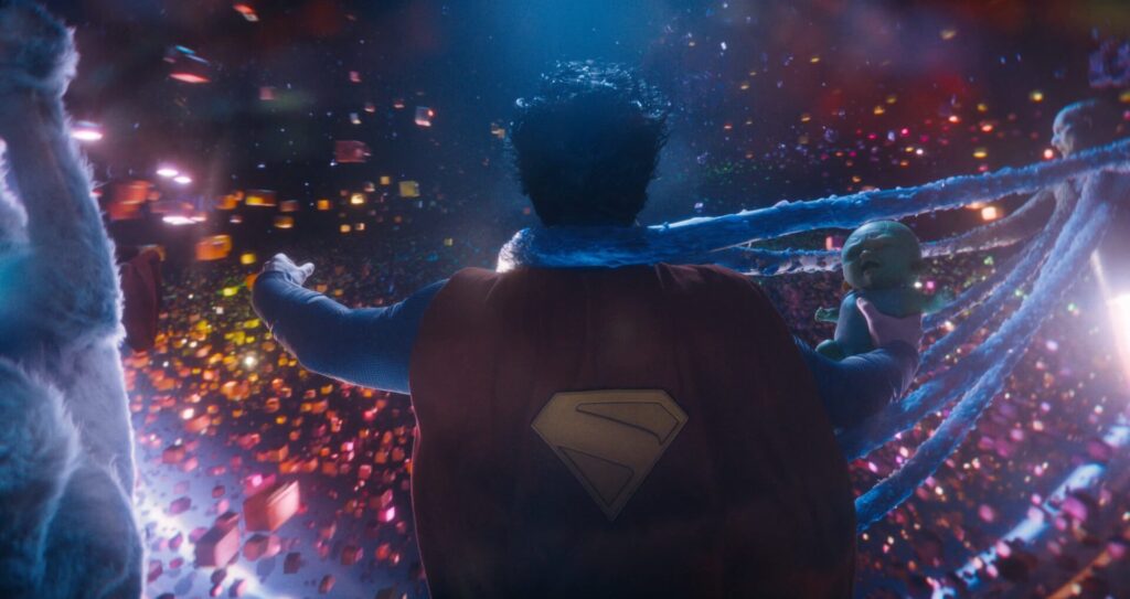 E acima de tudo se trata de David Corenswet se tornando um astro ao encapsular a gentileza e a visão inocente de Superman, mas também através de como isso é expressado em relações com Krypto, pais, civis, namorada e outros heróis. Ao longo da aventura que explora escalas aumentando cada vez mais vemos ele em crise de identidade mas sempre disposto a ajudar qualquer forma de vida, ele reage emotivamente e também toma atitudes erradas.