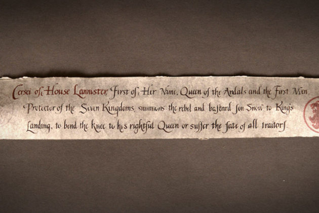 Foi divulgado o conteúdo da carta que Cersei enviou para Jon Snow no episódio de estreia da sétima temporada de Game of Thrones. Fotos da carta foram publicadas pela HBO e mostram que Cersei mantém sua empáfia, apesar da fragilidade de seu reinado. Confira:
